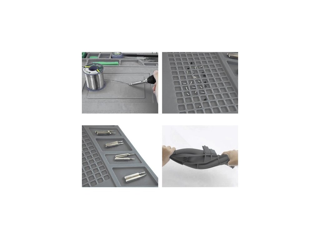 MAGNETICKÉ VRECKY - silikónová podložka má 4 magnetické vrecká. Udrží aj tie najmenšie skrutky na svojom mieste, aj keď sa podložka pohne. Nenechajte sa zachytiť skrutkami unikajúcimi zo stola! Pracujte pohodlne a rýchlo so všetkým, čo potrebujete po ruke.
