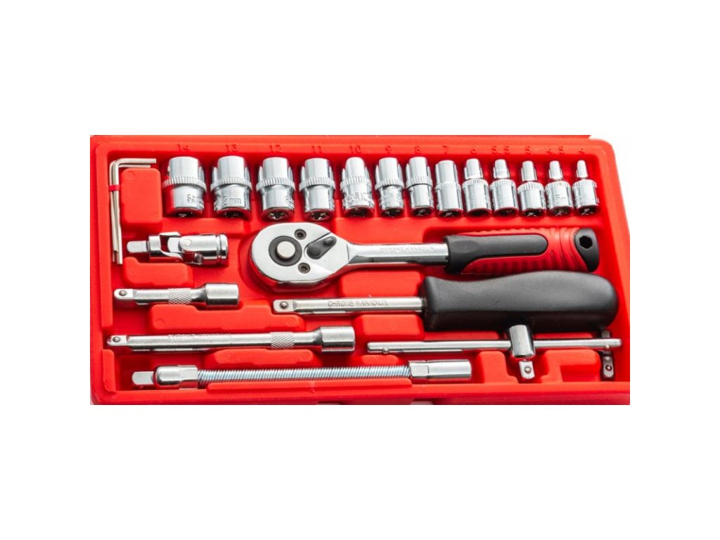 Doplnené nástavcami (vrátane pružných), univerzálnym kĺbom, šesťhrannými kľúčmi, rukoväťou v tvare T a držiakom bitov. Prvky sú zoradené v praktickej postupnosti. Sada je ideálna pre profesionálne i amatérske použitie. Profesionálne výroba a kalená chróm-vanádová oceľ zaisťujú jej spoľahlivosť a trvanlivosť.