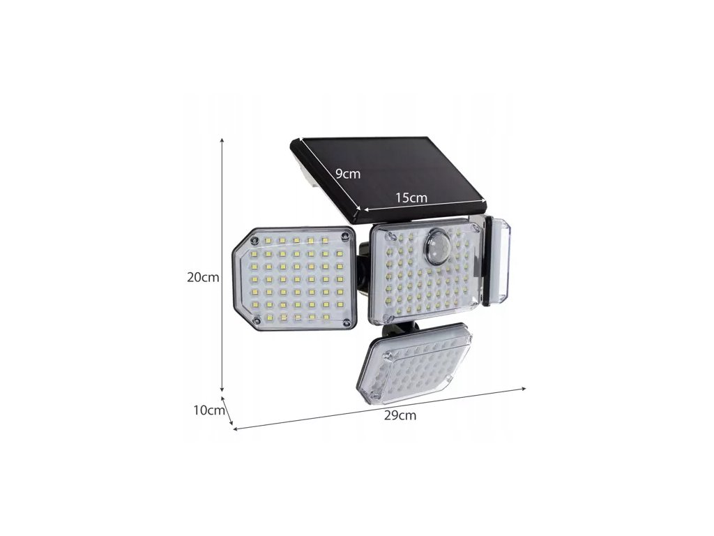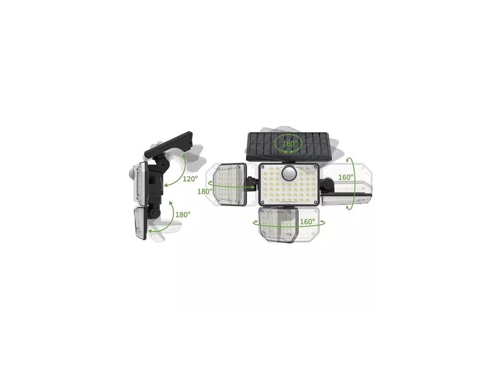 NASTAVENIE UHLA NÁKLONU + SENZOR POHYBU PÍR A SÚMRAK - 3 svietidlá a panel majú nastavenie uhlov náklonu: hore, dole, do strán. Reflektor má vstavaný pohybový a súmrakový senzor, vďaka ktorému v závislosti od režimu rozsvieti sa až po zotmení, kedy zaznamená pohyb v bezprostrednej blízkosti.