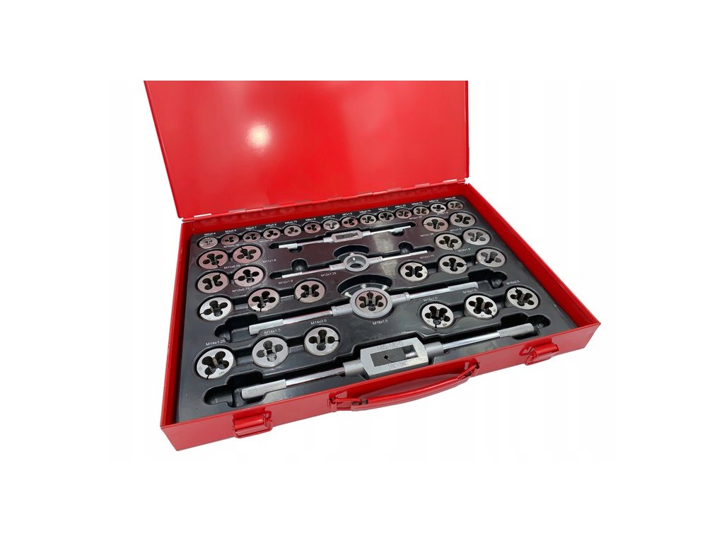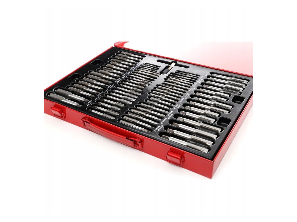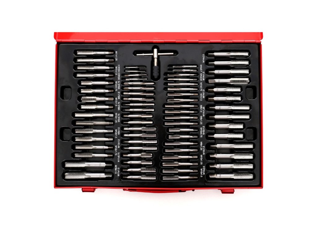 110-dielna sada metrických závitníkov a závitových očiek zo štandardnej nástrojovej ocele pre ručné závitovanie pomocou vratidla.]