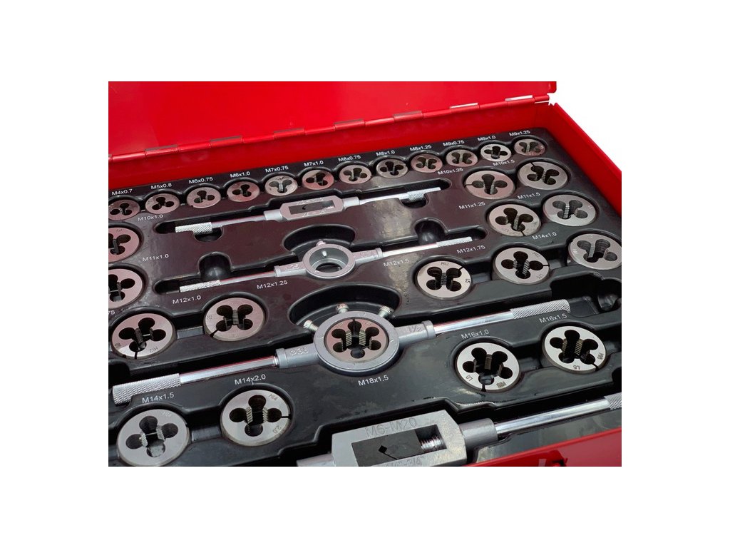 35 x 2 ks závitníky: M2x0,4 mm; M3x0,5mm; M4x0,7mm; M5x0,8mm; M6x0,75mm; M6x1,0mm; M7x0,75mm; M7x1,0mm; M8x0,75mm; M8x1,0mm; M8x1,25mm; M9x0,75mm; M9x1,0mm; M9x1,25mm; M10x0,75mm; M10x1,0mm; M10x1,25mm; M10x1,5mm; M11x0,75mm; M11x1,0mm; M11x1,25mm; M11x1,5mm; M12x0,75mm; M12x1,0mm; M12x1,25mm; M12x1,5mm; M12x1,75mm; M14x1,0mm; M14x1,25mm; M14x1,5mm; M14x2,0mm; M16x1,0mm; M16x1,5mm; M16x2,0mm; M18x1,5mm;