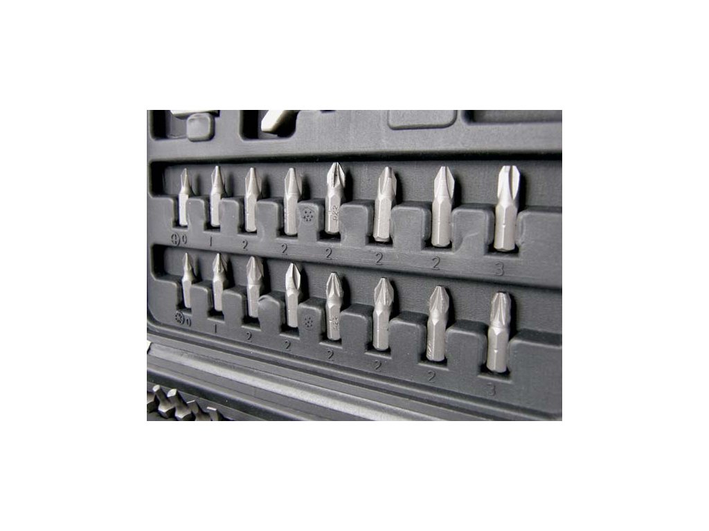 Sada bitov pre vŕtačku 100 prvkov z veľmi kvalitných materiálov. Bity zabalené plastovom kufríku.