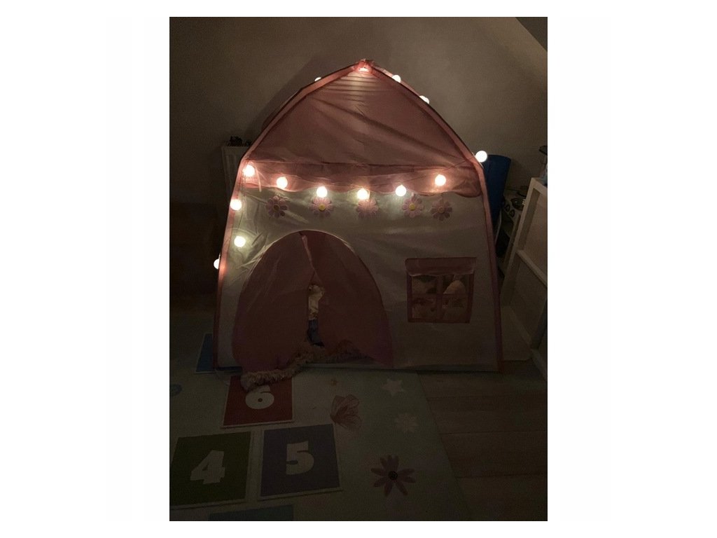 - SÚČASŤOU SVIETIACEJ GARLANDY - stan je dodávaný so svetielkami "bavlnenými guličkami" napájanými 2 x AA batériami (nie sú súčasťou), čo umožňuje ich použitie vonku aj vo vnútri stanu, pretože nemusíte hľadať miesto s napájaním . Farba svetiel je ružová a biela. Celé to pozostáva z 20 lámp. Šnúrka so svetielkami je dlhá 2,8 m.