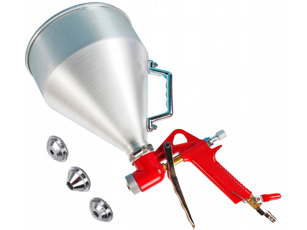 Vyrobená z hliníka, vďaka čomu je ľahká a pohodlná pre prácu. Použitie pištole šetrí materiál a zaisťuje rovnomerné nanášanie. Zabudovaná regulácia prívodu vzduchu umožňuje presnú aplikáciu materiálu. Sada obsahuje tri vymeniteľné trysky, ktoré umožňujú vybrať optimálny priemer aplikovaného materiálu, v závislosti na jeho hustote. Nádrž s objemom 6 litrov umožňuje dlhú dobu aplikácie farby bez častého doplňovania.