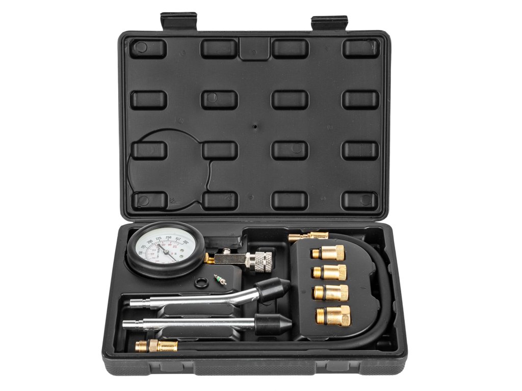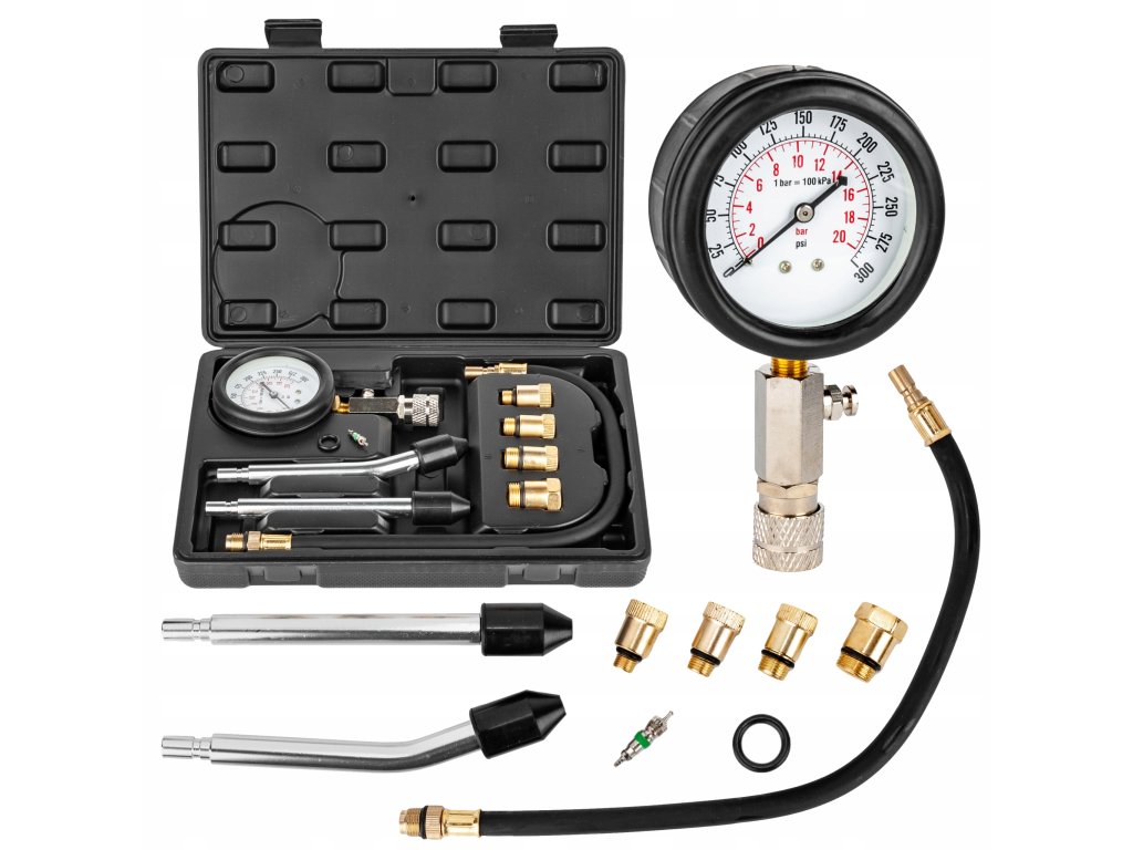 Prístroj je včlenený do sady v plastovom kufríku, ktorá obsahuje tlakomer 0-20 bar, opatrený vypúšťacím ventilom, umožňujúcim opakovanie merania kompresie rovnakého valce bez vyskrutkovaní koncovky, vysokotlakovú pripojovacie hadicu dl. 400 mm, na ktorú možno pripojiť niektorý z napojovacích adaptérov so závitmi (M18x1,5 / M14x1,25 / M12x1,25 / M10x1,0).