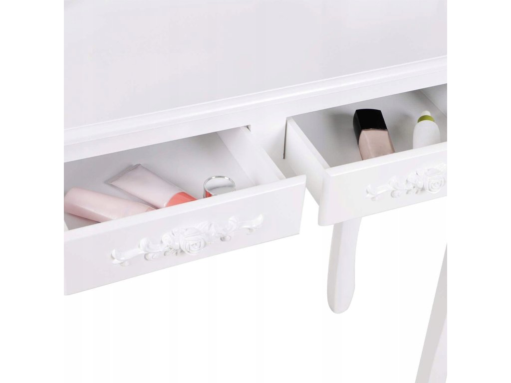 Toaletný stolík má praktickú zásuvku s ozdobnými gombíkmi - vhodná na ukladanie kozmetiky a šperkov.