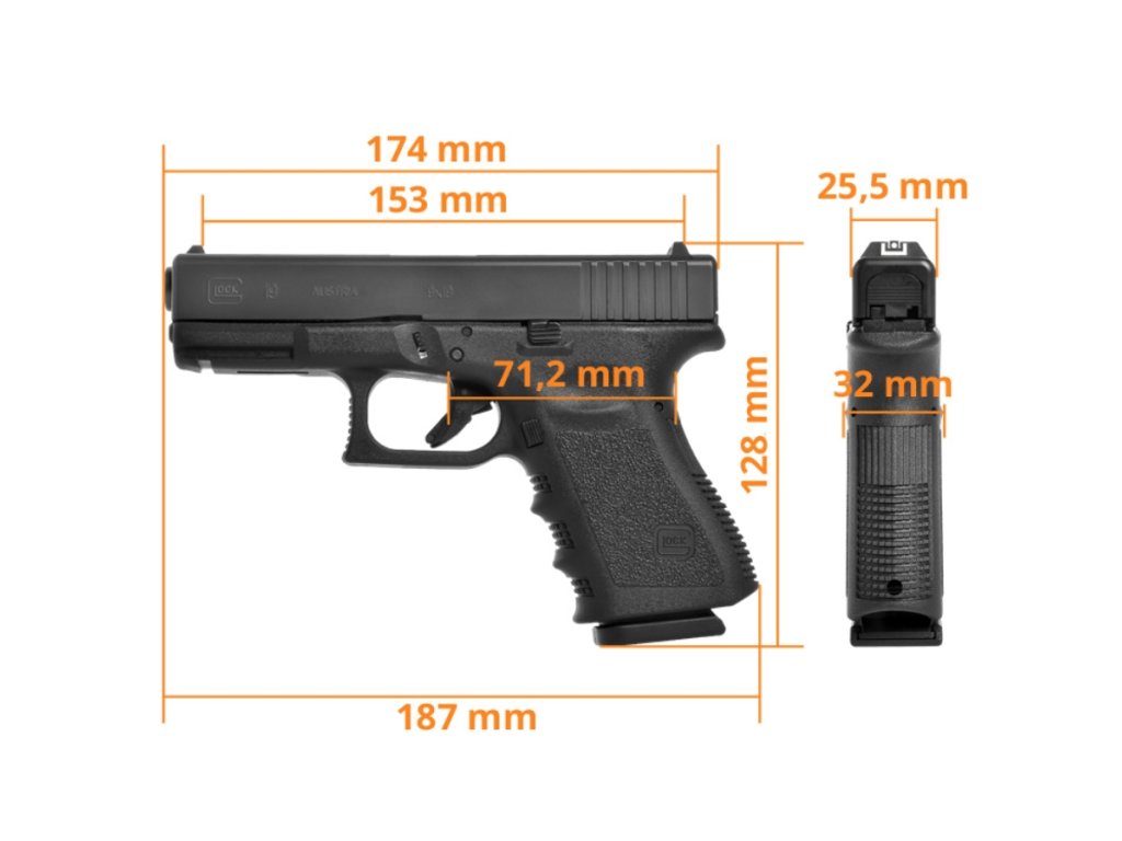 Po vložení CO₂ bombičky a nabití streliva je hmotnosť vzduchovej pištole takmer rovnaká ako hmotnosť skutočnej pištole Glock 19 tretej generácie (bez munície).